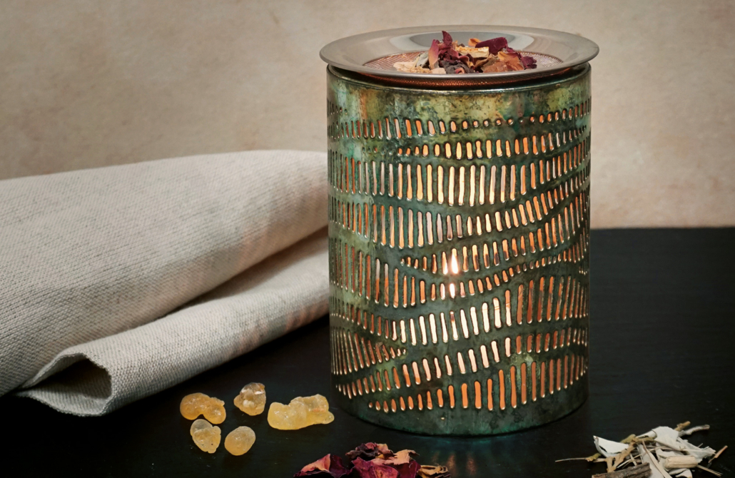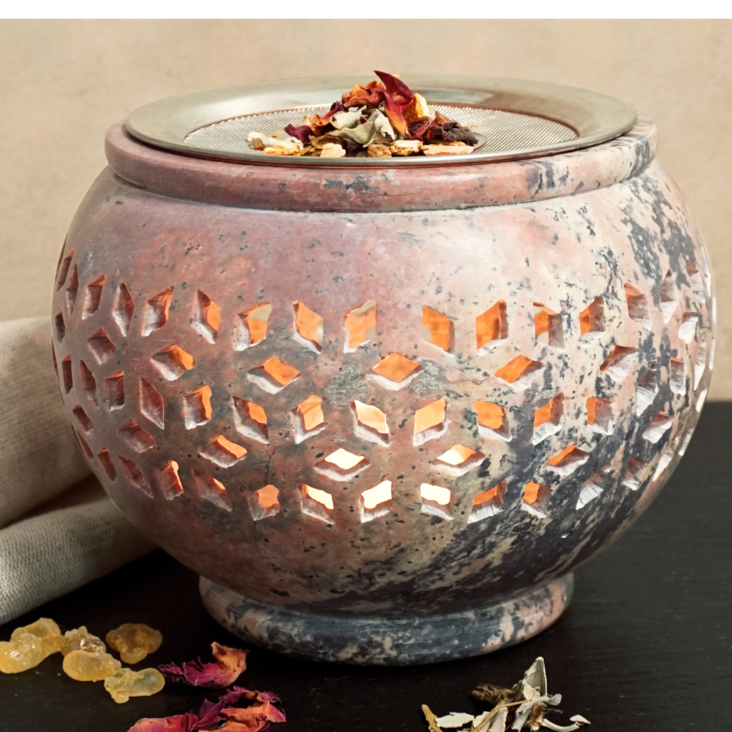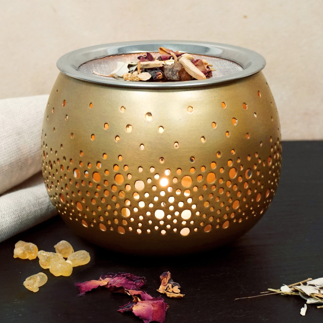 - Räuchergefäß vorbereiten – Wähle einen Weihrauchbrenner oder ein Räuchergefäß nach deinen Vorlieben. Beim Brenner stellst du das Teelicht in die Mitte und legst das Sieb darauf. Ein Räuchergefäß füllst du mit ausreichend Sand, bevor du die Kohle darauf platzierst.