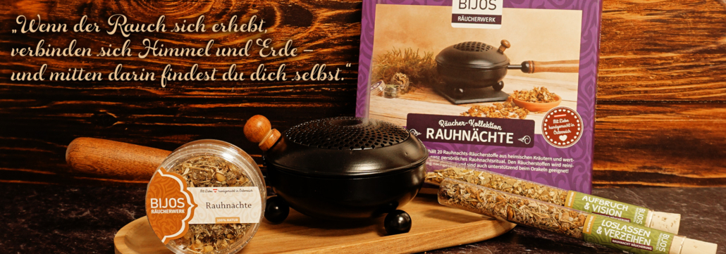 - Räucherwerk wählen – In der BIJOS Räucherbox „Magie der Rauhnächte“ “ findest du alle Zutaten für deine Rauhnächte Ritual. Weitere stimmige Räuchermischungen und Räucher-Sets aus unserem Programm können dich durch diese besondere Zeit begleiten. Jeder Duft öffnet eine neue Tür zu deinen Themen der jeweiligen Nacht.
